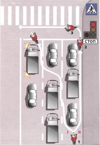 Безопаснее дождаться, когда поток остановится (1), а затем проследовать по одному из двух вариантов маршрута и занять позицию: I - впереди стоя¬щих машин; II - перед пешеходным переходом, чтобы на «пешеходный» зеленый пересечь улицу (3), перед светофором