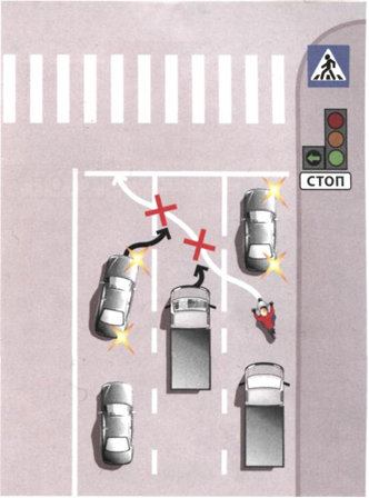 Другой способ безопасно попасть в левый ряд - остановиться справа, дождаться, когда предыдущий светофор перекроет движение, а затем, как положено, включив «поворотник», перестроиться. Формально это - нарушение Правил. Так что ва¬риант с пешеходным переходом все же лучший.